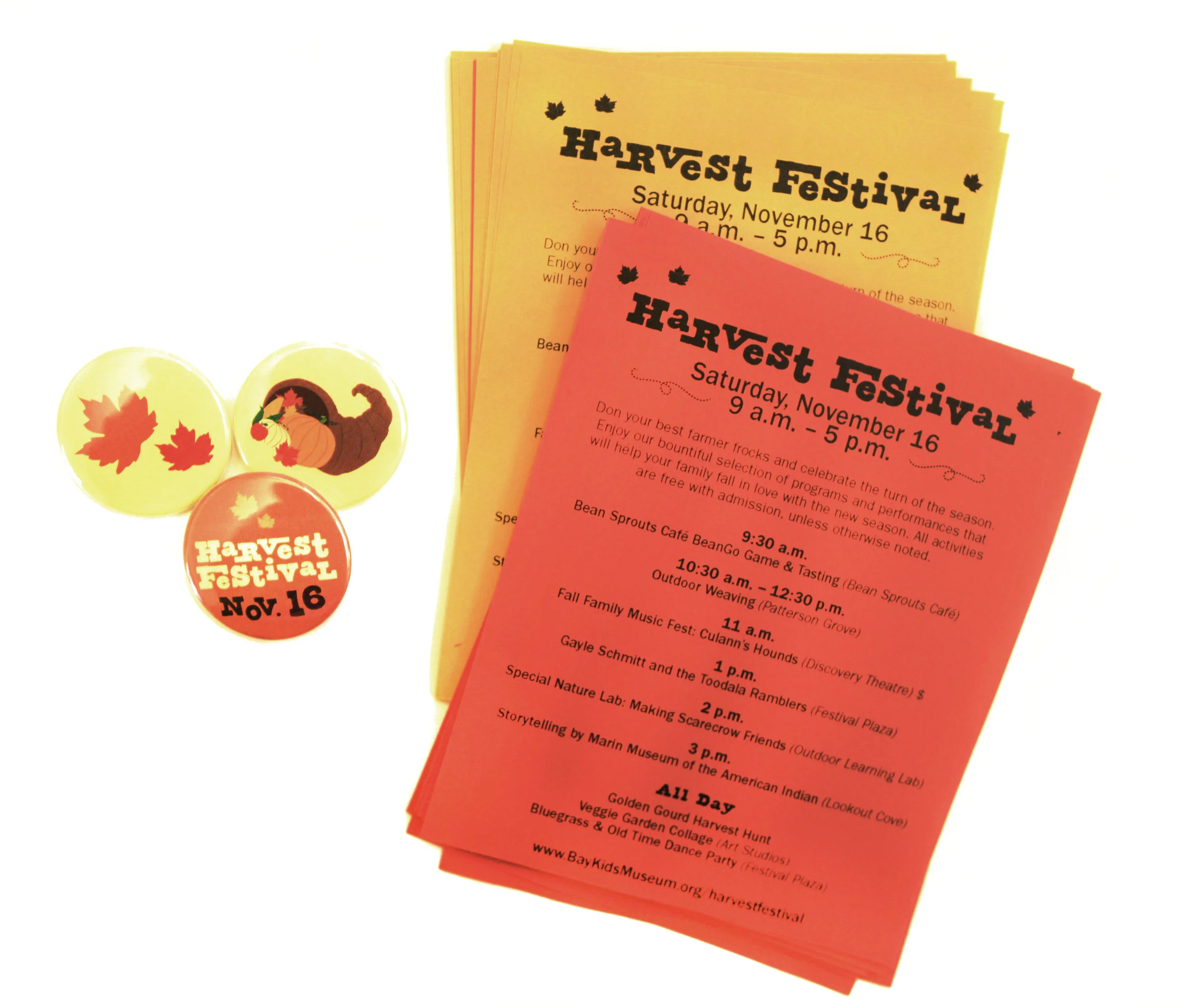 The Harvest Festival is an annual event at the Bay Area Discovery Museum and in 2013 I was responsible for the event branding and creating all the assets for the event, like signage, handouts, pins, and ads. I really enjoyed creating the typography for this event and overall, had a lot of fun with it.